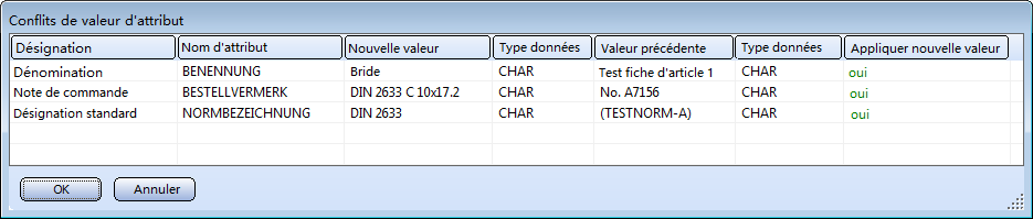 S'il y a un conflit entre les valeurs d'attributs qui sont données d'une part par le fichier VAA et d'autre part par la fiche d'article à transférer, la fenêtre suivante s'ouvre (exemple) :