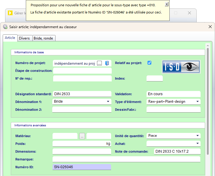 La fiche d'article transférée était auparavant classée comme Divers. Comme le fichier VAA prescrit ici la classification comme Bride, ronde, la fiche d'article est maintenant également classée comme Bride, ronde.