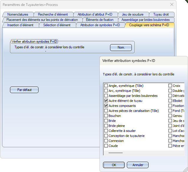 Vous pouvez spécifier ici les types d'éléments à prendre en compte pour vérifier le couplage des symboles. Cliquez sur le bouton Liste, choisissez les types d'éléments souhaités dans la fenêtre Vérifier attribution symboles P+ID, et quittez la fenêtre en cliquant sur OK.