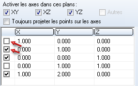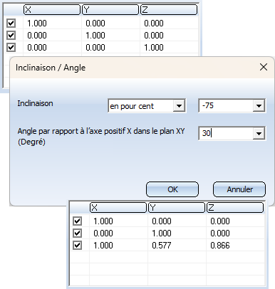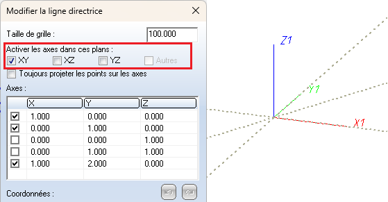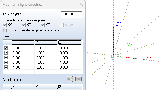 Par défaut, trois directions d'axe sont prédéfinies et activées, qui sont parallèles au système de coordonnées actif. Si pour un axe, une valeur n'est indiquée que dans une colonne, l'axe est parallèle à l'axe de coordonnées correspondant du système de coordonnées actif (système de coordonnées mondial ou local). La hauteur de cette valeur ne joue alors aucun rôle.