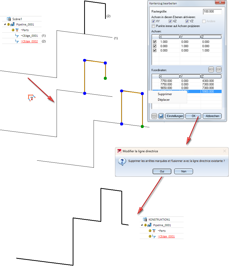 Comme lors de l'insertion d'une nouvelle ligne directrice, le système vérifie également après la modification de ligne directrice existantes s'il existe dans la tuyauterie une ligne directrice sur laquelle se trouvent à la fois le point initial et le point final de la ligne directrice modifiée. Si c'est le cas, les lignes directrices qui seraient supprimées lors du rognage sont mises en évidence en couleur. Un message correspondant est affiché simultanément.