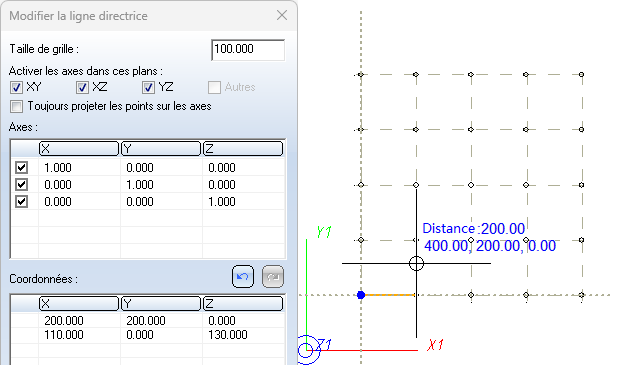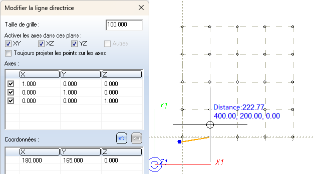 L'origine de l'axe pour la saisie graphique du point suivant de la ligne directrice est placée sur le point précédent de la ligne directrice.