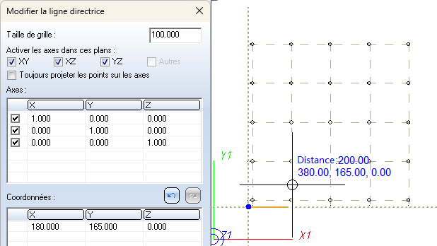 Si le point précédent ne se trouve pas sur un point de la grille précédente, la grille est déplacée de sorte que le point précédent se trouve ensuite sur un point de la grille. Les coordonnées des points de la grille continuent toutefois de se référer au système de coordonnées actuellement en vigueur.