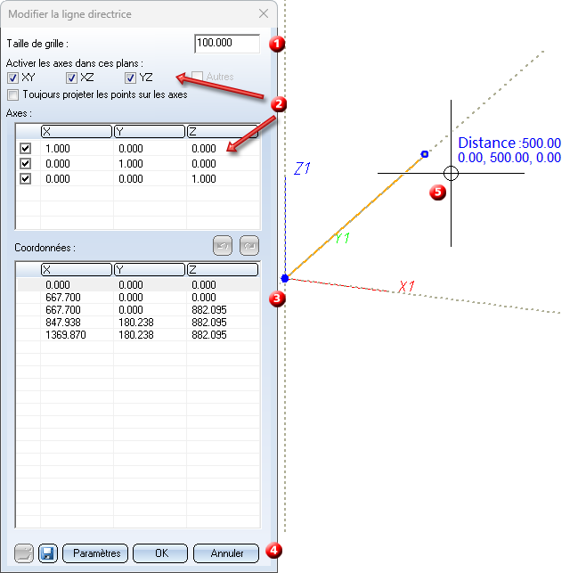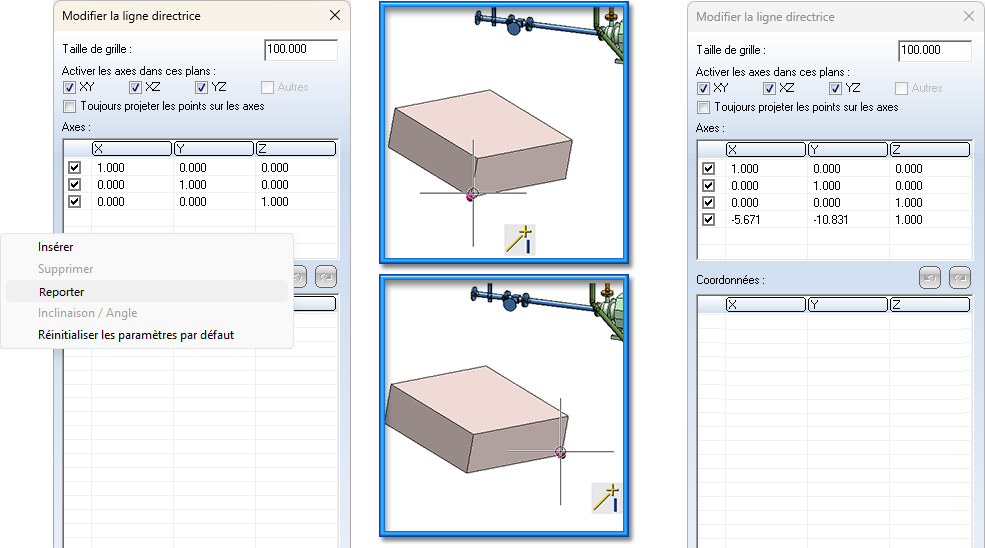 - La direction d'un axe pour le traçage des lignes directrices peut - outre la valeur prédéfinie par X, Y et Z - être obtenue en saisissant deux points du plan d'implantation.