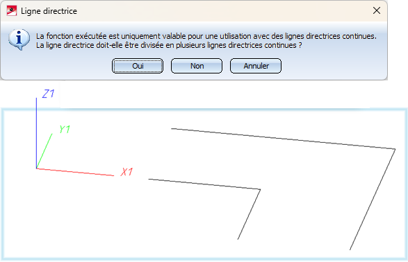 Les lignes directrices créées avec l'éditeur de ligne directrice doivent, contrairement à la création sous forme d'esquisse, être créés de manière continue. Si l'éditeur est utilisé sur une ligne directrice non continue, un message d'avertissement correspondant apparaît :
