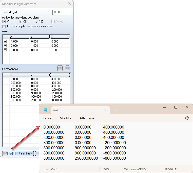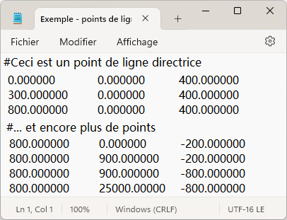 Charger une liste de points Ce bouton permet de charger les points d'une ligne directrice à partir d'un fichier texte. Il faut tenir compte des points suivants :