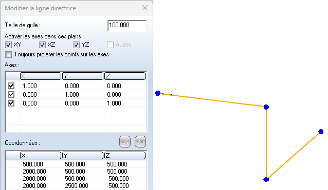 Comme nous l'avons déjà mentionné, l'éditeur de ligne directrice permet de définir des axes sur lesquels les points saisis avec le curseur graphique sont projetés. Cela s'applique généralement aux points saisis librement avec le curseur. Si vous souhaitez que cela s'applique également aux points définis avec des options de capture telles que I, J, M, Z, etc. ou via le menu Options de point, vous devez cocher la case Toujours projeter les points sur les axes. Ceci est utile, par exemple, lors du traçage de lignes directrices qui doivent être tracées parallèlement aux structures existantes. Pour en savoir plus sur l'utilisation de cette case, consultez cet exemple.