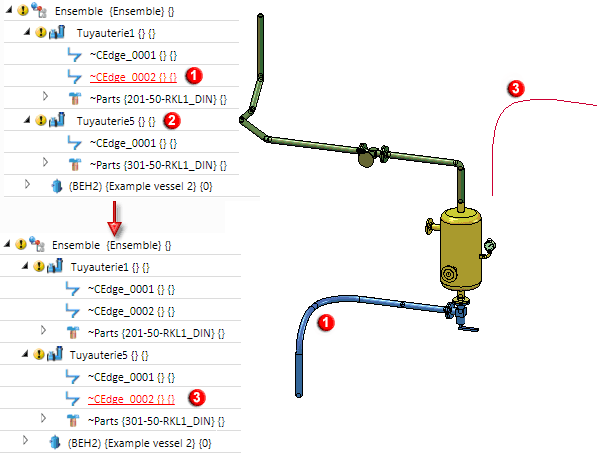 (1) Ligne directrice sélectionnée (avec éléments, tuyau coudé), (2) tuyauterie cible, (3) copie de la ligne directrice