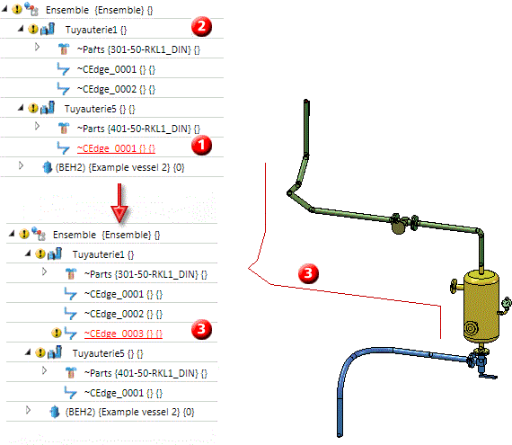 (1) Ligne directrice sélectionnée, , (2) tuyauterie cible, (3) copie de la ligne directrice