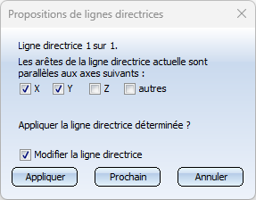 Dans cette fenêtre, HiCAD vous indique le nombre d'alternatives de tracés de lignes directrices possibles. Le bouton Suivant permet de passer à l'alternative suivante lorsque plusieurs tracés sont possibles. En outre, il est indiqué pour la ligne directrice actuelle à quels axes ses arêtes sont parallèles.
