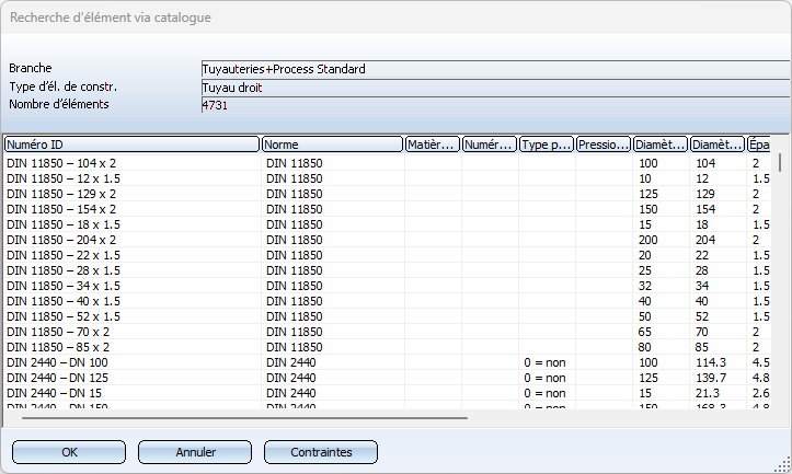 Si vous avez choisi la sélection d'élément par Catalogue HiCAD, une liste de sélection des éléments disponibles en fonction des paramètres donnés et de la situation actuelle en matière d'insertion s'affiche.