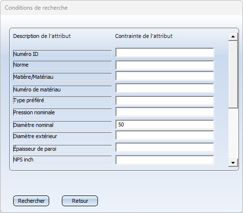 La recherche d'attributs numériques peut également contenir les opérateurs <, >, <=, >=, != . Vous pouvez également lier des contraintes avec & (ET logique). Exemple : si vous souhaitez limiter la recherche aux éléments dont l'épaisseur de paroi est comprise entre 2 et 4 mm, saisissez la contrainte >= 2 & <= 4.