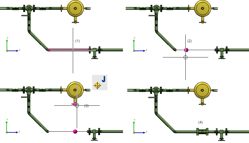 Dans l'illustration, une fixation de tuyau (4) doit être installée sur l'élément (1). Après avoir sélectionné le tuyau, celui-ci est masqué (2) et la position d'insertion peut maintenant être choisie librement (3).