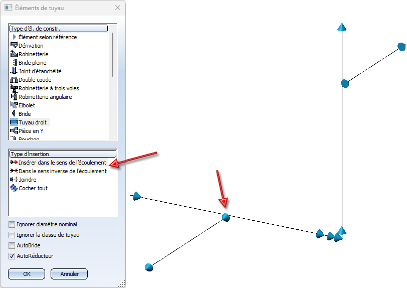 Le type d'insertion sélectionnée reste valable jusqu'à ce qu'un autre élément soit sélectionné. HiCAD revient alors automatiquement à l'option Élément dans le sens de l'écoulement. En fonction de l'élément et du mode de ligne directrice sélectionnés, HiCAD propose d'autres options d'insertion. Dans les rubriques suivantes, nous décrivons ces options pour les différents types d'éléments.
