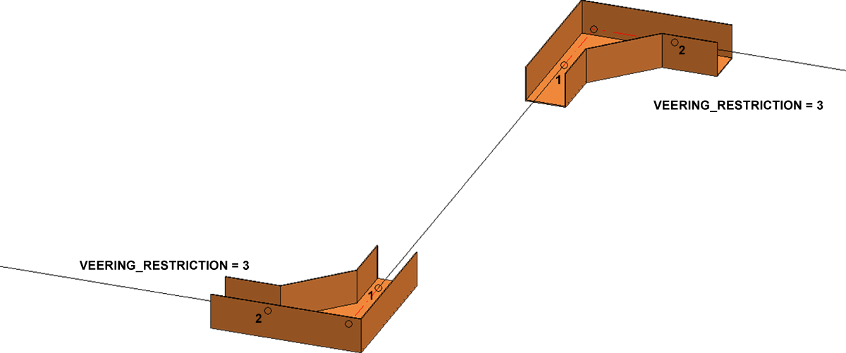 Dans l'exemple suivant, un élément, dont la valeur VEERING_RESTRICTION est de 3, a été autoplacé la même chaîne d'arêtes :