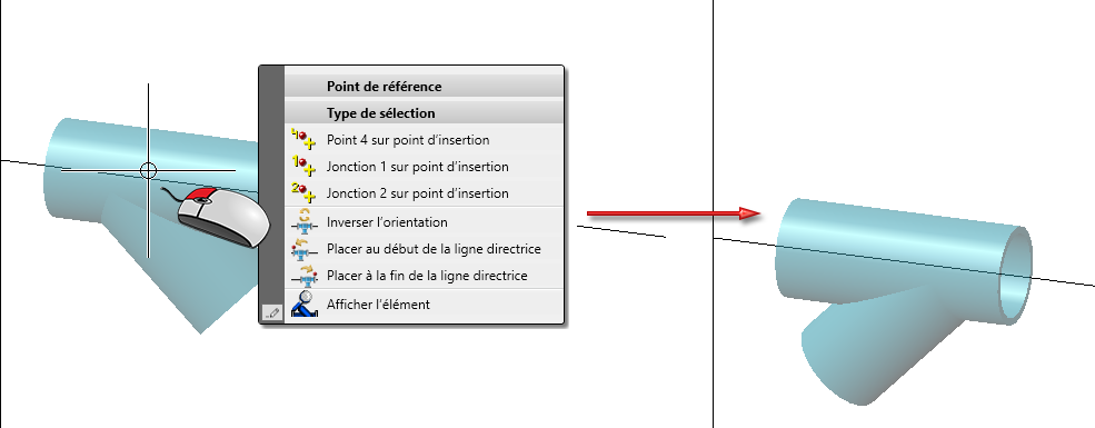 - Sélectionnez d'abord un point de référence dans le menu Point de référence, puis choisissez Jonction 1 ou 2 ou un point sur la ligne entre les deux points. L'élément s'affiche avec le point de référence spécifié au niveau le curseur.