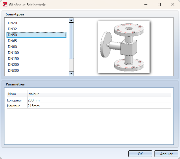 Pour chaque diamètre nominal, les valeurs de longueur et de hauteur de la robinetterie sont prédéfinies dans la zone Paramètres. Ces valeurs peuvent être ajustées individuellement.