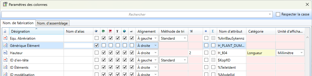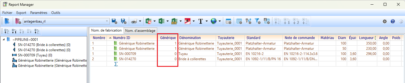 Dans l'exemple illustré, la nomenclature de fabrication du Report Manager a été complétée par la colonne Générique Élément.