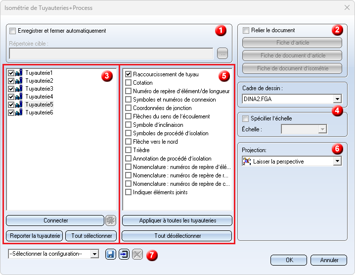 . - Les paramètres par défaut de la fenêtre de dialogue sont influencés par les paramètres du Gestionnaire de Configuration indiqués sous ...> Tuyauteries+Process > Isométrie et Schéma de tuyauterie .