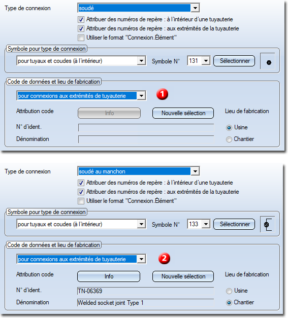 - Lors de l'orientation des symboles des éléments et des corps de connexion dans l'isométrie, ce sont les conduites entières de la tuyauterie qui sont prises en compte afin d'obtenir une orientation uniforme.