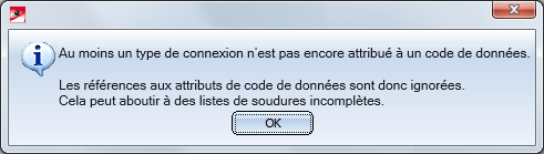 Cliquez sur OK pour lancer la génération de l'isométrie / du schéma de tuyauterie. HiCAD vérifie d'abord qu'un code de données HELiOS est attribué à tous les types de connexion. Une attribution du code de données est effectuée pour tous les types de connexion par ISD lors de l'insertion, à condition que les articles par défaut soient disponibles dans la base de données HELiOS. Ce n'est que si ce n'est pas le cas que les renvois aux attributs des codes de données sont ignorées. Cela peut aboutir, en particulier pour les nomenclatures de soudures, à ce que celles-ci soient incomplètement remplies.
