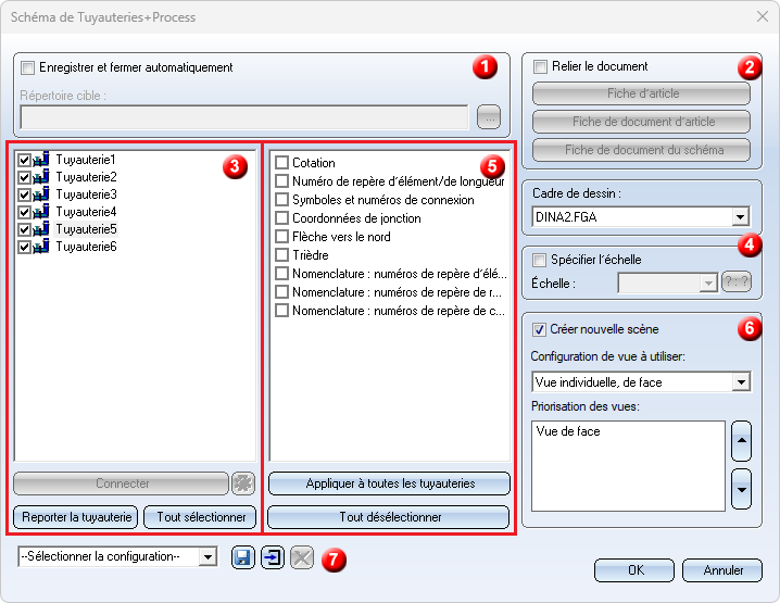 Pour mettre fin à la sélection des éléments et démarrer la création du schéma de tuyauterie, appuyez sur le bouton du milieu de la souris. La fenêtre de dialogue Schéma de Tuyauteries+Process s'ouvre alors.
