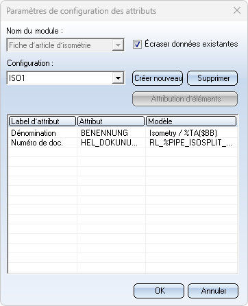 Chargez la configuration souhaitée en sélectionnant le nom correspondant dans la liste de choix Configuration (des configurations sont prédéfinies par ISD, par exemple ISO1 pour les isométries et SPOOL1 pour les schémas de tuyauterie). Une fois la configuration sélectionnée, l'affectation d'attribut correspondante s'affiche.