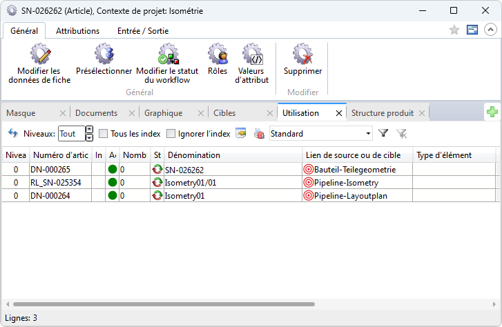 Jusqu'à HiCAD 2011, un lien Teilegeometrie-Konstruction était créé à partir du document de la géométrie de l'élément de la tuyauterie vers la Planification d'implantation, et un lien Teil-Konstruction à partir de la fiche d'article vers les documents d'isométrie générés. L'isométrie utilise ses propres liens, spécialement prévus pour elle, par défaut sans validation, et toujours liée directement à la fiche d'article :