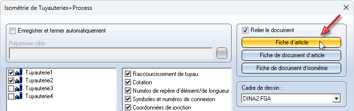 Activer ce paramètre a les effets suivants lors de l'exécution de la fonction Générer automatiquement le dessin / Générer le schéma de la tuyauterie : si les tuyauteries à dériver sont sélectionnées dans la fenêtre de dialogue et si la case Relier le document est cochée, le masque Modifier la fiche d'article s'affiche pour chaque tuyauterie sélectionnée, ce qui vous permet d'y modifier les données si nécessaire.