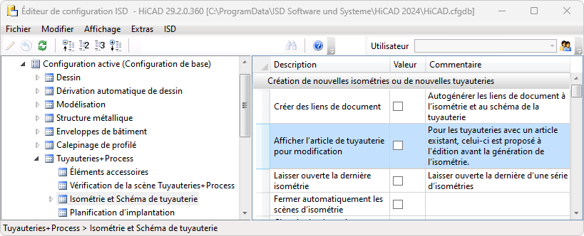 Les configurations sont stockées dans le fichier WORKSHOPDAT.XML situé dans le répertoire HiCAD SYS. Veillez à faire régulièrement une sauvegarde de ce fichier.