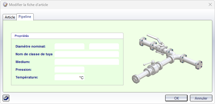 dans la fenêtre de dialogue de l'article concerné, puis cochez la case Pipelinedans la fenêtre de dialogue Classification. Vous pouvez ensuite attribuer/modifier les attributs du diamètre nominal, du poids et du nom de la classe de tuyaux.