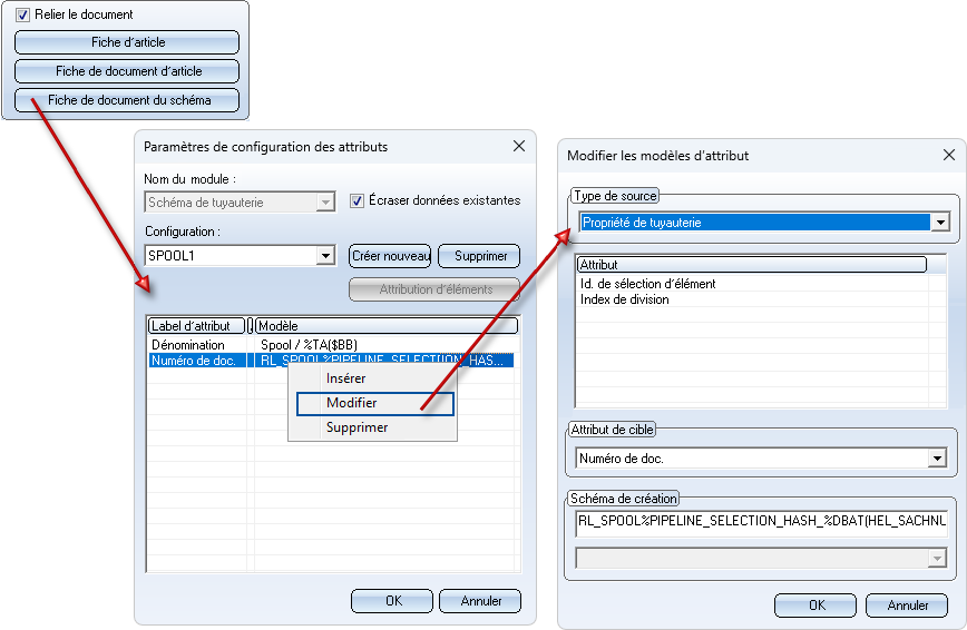 Les fiches de document et d'article sont automatiquement créées dans la base de données pour la tuyauterie. Les affectations d'attributs peuvent être définies à l'avance. Vous avez la possibilité d'utiliser différentes configurations d'affectation d'attributs.