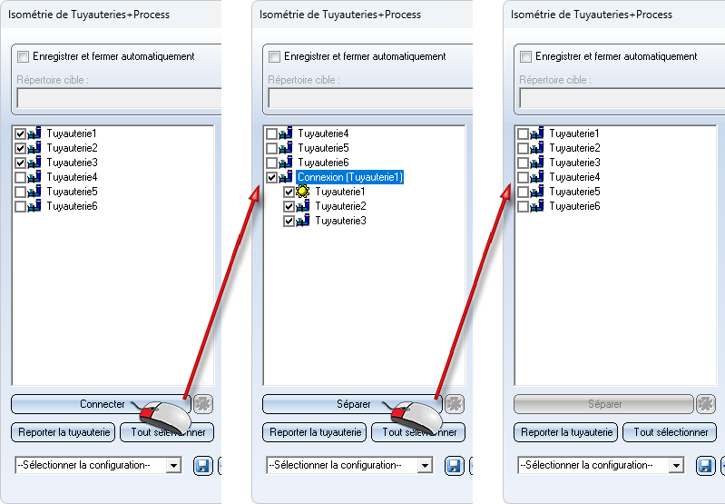 Le bouton Connecter est modifié par le contexte d'utilisation. Si vous avez sélectionné un groupement de tuyauteries dans la liste, le libellé du bouton devient Séparer. Un clic sur celui-ci décompose à nouveau le groupement en différentes tuyauteries individuelles.
