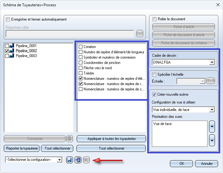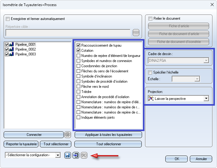 Les paramètres entourés ci-dessous en bleu sont enregistrés pour l'isométrie ou le schéma de tuyauterie.
