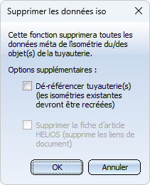 Cette fonction permet également, optionnellement, d'annuler les références à la tuyauterie (les fichiers .KRA et la fiche d'article sont alors supprimés) et de supprimer l'ensemble des données de fiche HELiOS générées. Si la fiche d'article est supprimée, le lien avec les isométries existantes ou d'autres documents éventuels est perdu, c'est pourquoi il est proposé dans ce cas de lister les documents concernés. Cette demande est identique à celle de la suppression des tuyauteries référencées.