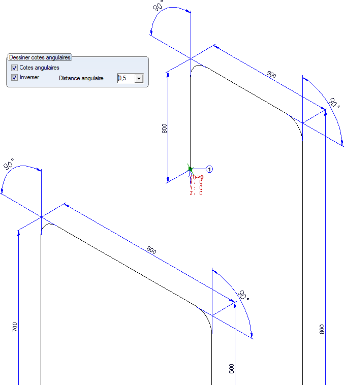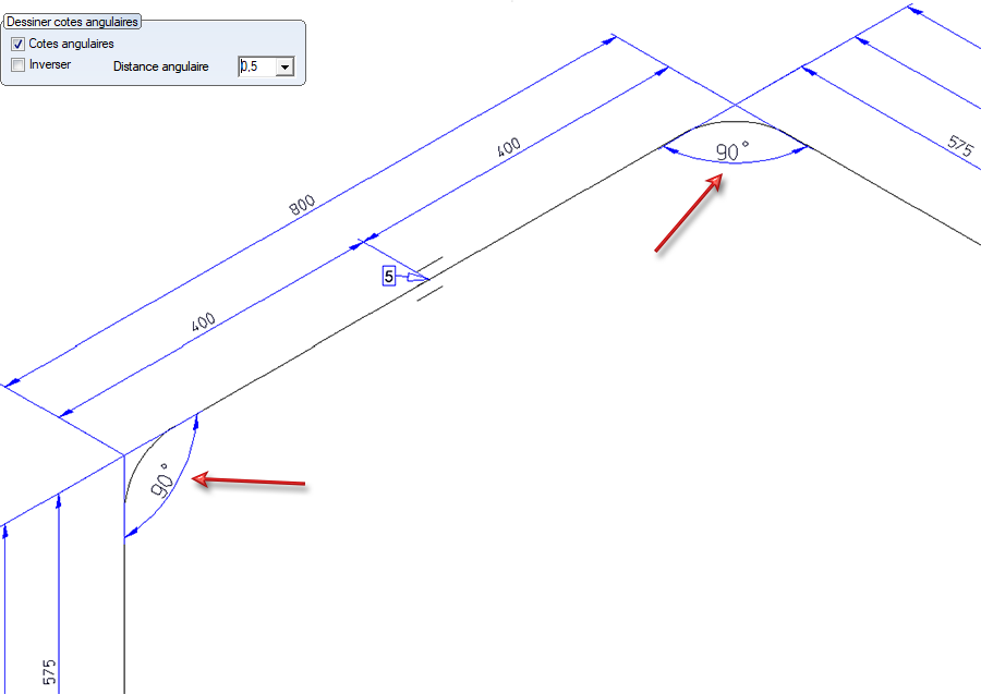 Les autres paramètres sous Dessiner cotes angulaires permettent de déterminer avec précision à quelle distance et avec quelle orientation les angles doivent être tracés.