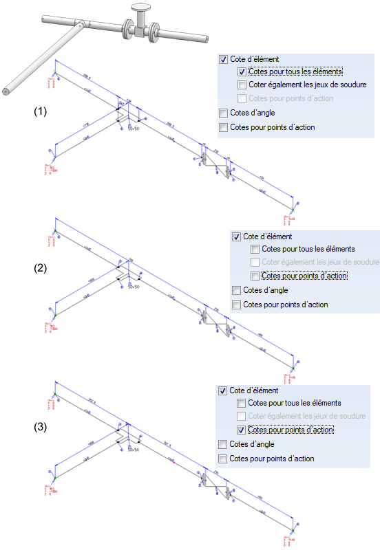 Les éléments et composants de la tuyauterie sont cotés. Une distinction est faite entre les cotes pour tous les éléments et les cotes pour points d'action uniquement. Si la case Cotes pour tous les éléments est cochée, l'option Cotes également les jeux de soudures est également disponible. Cochez cette case si les jeux de soudure doivent également être cotés. - Cotes d'angles
