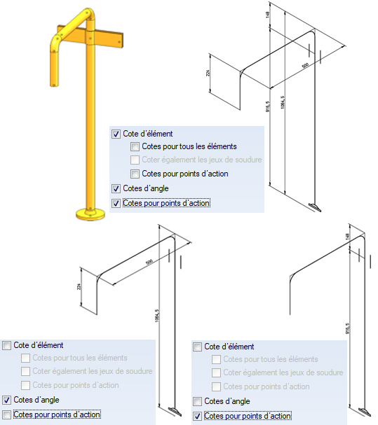 Si les coudes des tuyaux coudés doivent être munis de cotes pour faciliter la fabrication sur une cintreuse, vous devez cocher/décocher les cases de votre choix sous Dessiner cotes angulaires.