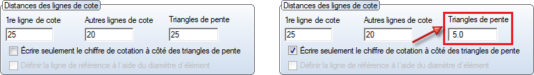 Si la case Écrire seulement le chiffre de cotation à coté des triangles de pente est décochée, une cote de segment est toujours utilisée pour les triangles de pente, mais avec une distance de cote alors affichée sous Triangles de pente. Si la case est décochée et que la distance des cotes sous les Triangles de pente est égal à la distance des cotes sous la 1re ligne de cotes, cela correspond au comportement des versions précédentes de HiCAD (avant HiCAD 2100.0).