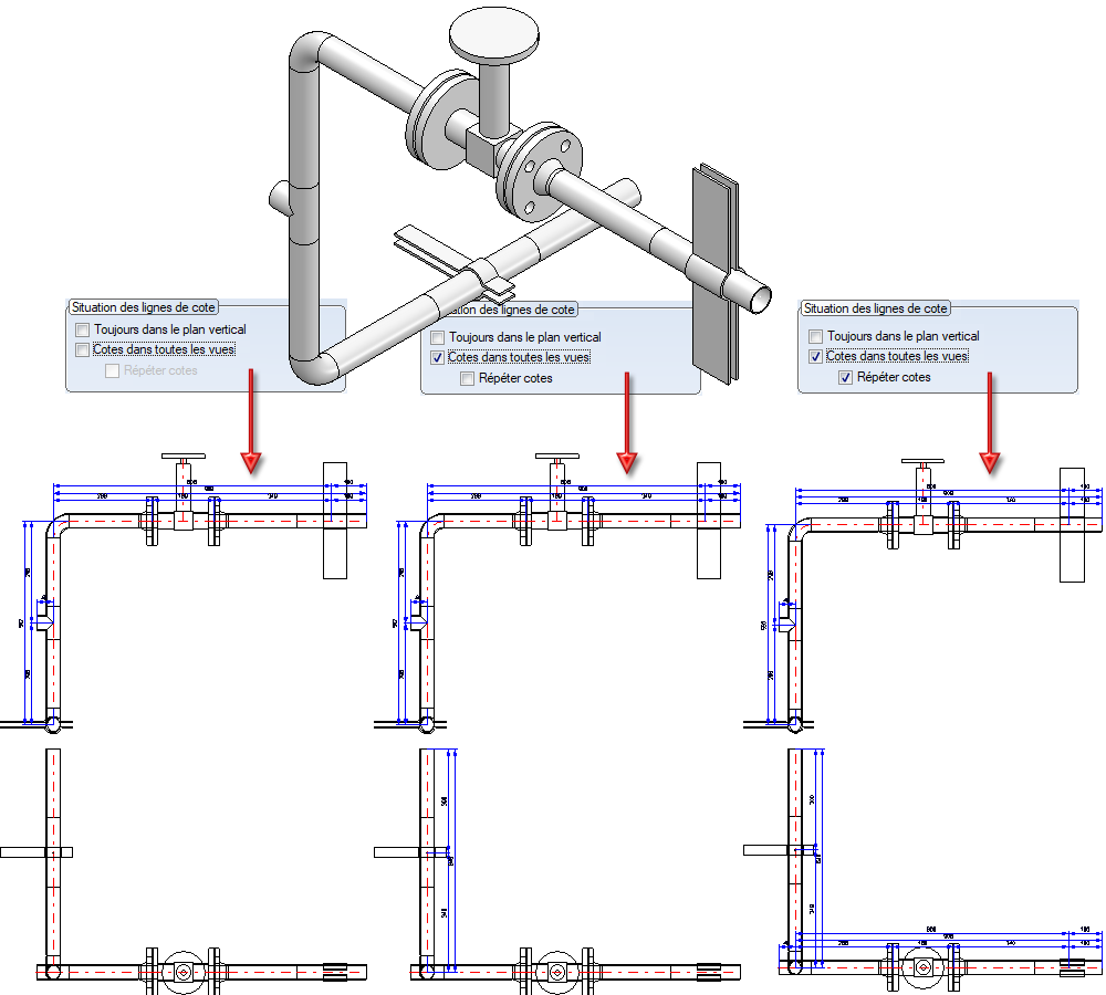 En cochant la case Cotes dans toutes les vues, il est possible de générer des cotations dans toutes les vues d'un schéma de tuyauterie. On procède de la manière suivante :