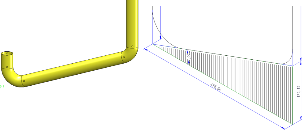 Dans l'illustration suivante, la cotation a été créée avec le paramétrage Inverser. On y voit clairement que l'extension de tous les angles est identique, quelle que soit la longueur des segments de tube adjacents.