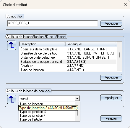La liste sous Repérage d'él. selon ou Repérage de longueur selon contient les clés à utiliser. Ces clés sont les mêmes que celles qui sont normalement utilisées dans les objets de texte. Par exemple, %TA(PKEY) correspond à la classe de l'élément et %DBAT(NENNWEITE) au diamètre nominal.