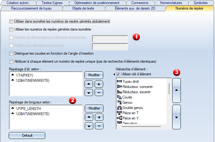 Tant dans l'isométrie que dans le schéma de tuyauterie, il est possible de lier l'ordre d'attribution des numéros de repère des éléments et des longueurs à l'ordre des propriétés des éléments que l'on a soi-même choisis. Ainsi, les numéros de repère peuvent être alloués d'abord en fonction du type d'élément, puis, si celui-ci est identique, en fonction du diamètre nominal. Il est possible de déterminer si l'attribution doit suivre l'ordre croissant ou décroissant.