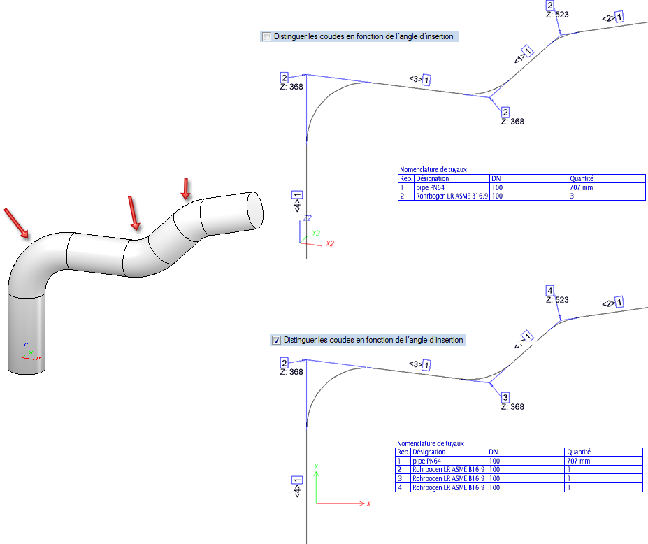 Si les coudes doivent être distingués dans les nomenclatures Tuyauteries+Process en fonction de l'angle d'insertion, il suffit de cocher la case correspondante. Le paramètre par défaut de ISD est de ne pas faire de distinction selon l'angle d'insertion.