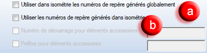 Si vous souhaitez allouer les numéros de repère globaux pour tous les éléments et que les isométries doivent utiliser ces numéros de repère, cochez l'option a et désactivez l'option b. Lors de la génération d'une isométrie, les numéros de repère globaux déjà alloués pour les éléments de la tuyauterie seront alors appliqués comme numéros de repère de l'isométrie. Ce paramétrage devrait être privilégié !