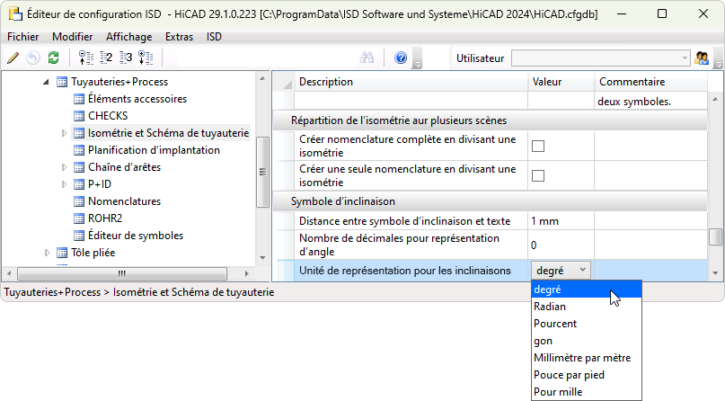 Vous trouverez des options de paramétrage plus détaillées pour les symboles d'inclinaison dans le Gestionnaire de Configuration sous Tuyauteries+Process > Isométrie et schéma de tuyauterie. Vous pouvez y choisir entre autres l'unité de représentation ainsi que le nombre de décimales.