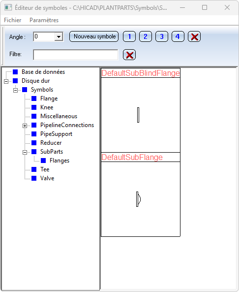 Vous sélectionnez ici le symbole pour la représentation des éléments secondaires de bride. La liste de choix contient tous les symboles qui se trouvent dans le répertoire PlantParts\Symbols\SubParts\Flangesde votre installation HiCAD. Ces symboles peuvent être modifiés à l'aide de l'Éditeur de symbole de Tuyauteries+Process. De nouveaux symboles peuvent également être ajoutés.