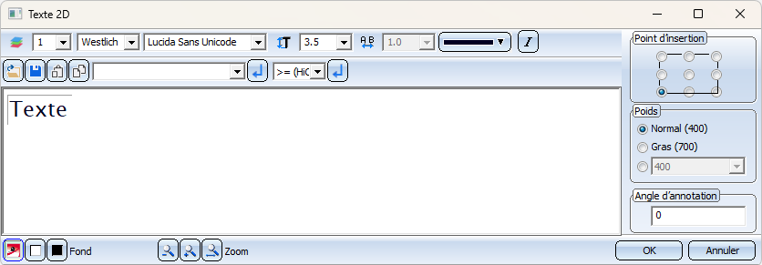 l'angle d'annotation. Celui-ci détermine la taille des caractères et l'inclinaison du texte.