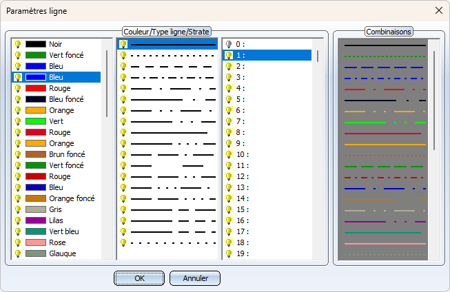 Si, par contre, vous souhaitez choisir les mêmes paramètres de ligne pour tous les types d'éléments, décochez la case. Dans ce cas, vous pouvez saisir la longueur/largeur de la flèche et, après avoir cliqué sur le bouton Paramètre ligne, choisir la couleur, le type de ligne et la strate de la ligne de référence.