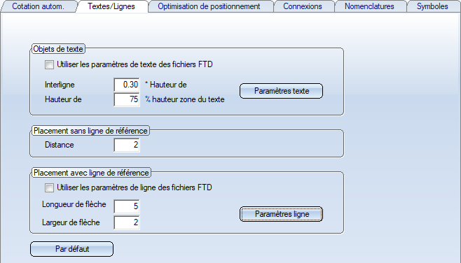 Si vous souhaitez utiliser pour les paramètres de ligne - couleur, type de ligne, strate ainsi que taille de flèche - des lignes de référence les paramètres des fichiers FTD que vous avez assignés aux types d'éléments dans l''encart Objet de texte, cochez la case Utiliser les paramètres de ligne des fichiers FTD.